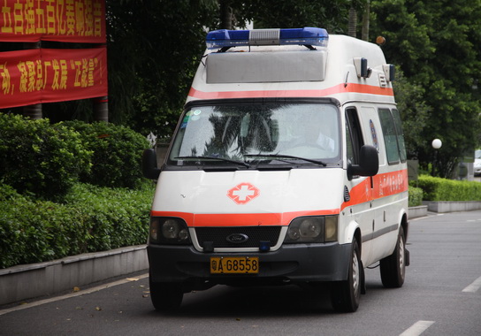 演练:一名腿部受伤的员工被担架抬到清静区,,,,,救护车鸣笛驶来